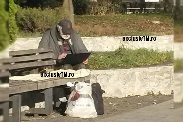 Om al străzii din Reșița, fotografiat în timp ce naviga pe internet de pe un laptop (FOTO)