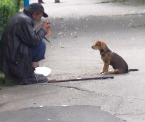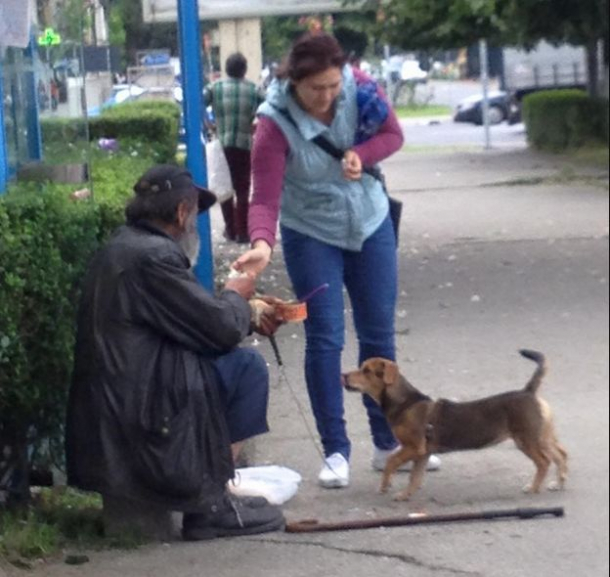 Elevul din Deva a rămas impresionat când a văzut cum, așezat pe un colț de trotuar, omul străzii dăruiește din bucățica lui patrupedului credincios. Cățelul, parcă, îl privește direct în ochi și, dacă ar putea, i-ar spune că e flămând și el, că îi este foame. Fără să stea pe gânduri, bărbatul renunță la o parte din mâncare pentru camaradul său cu patru lăbuțe, împărțind-o frățește.