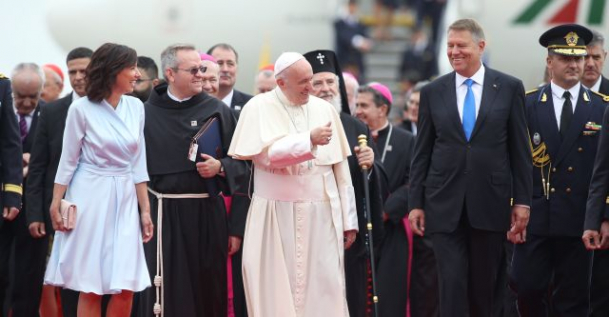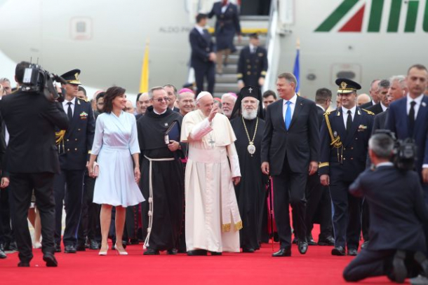 Papa Francisc a ajuns la București puțin după ora 11.00 și a fost întâmpinat de președintele României, Klaus Iohannis, și de Prima Doamnă, Carmen Iohannis.
