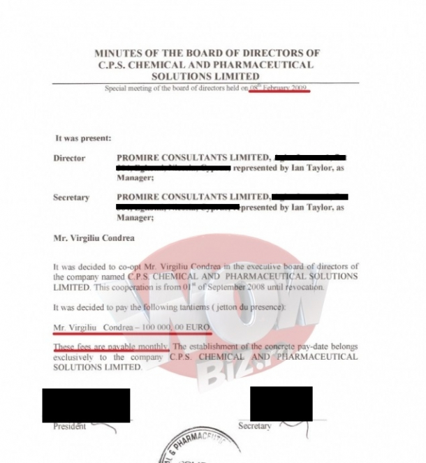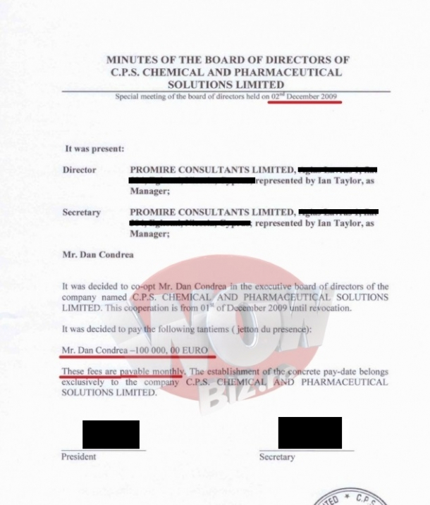 Primul astfel de document este datat 28 mai 2008 și consfințește că Dan Condrea este cooptat în boardul de conducere a companiei CPS Chemical And Pharmaceutical Solutions Limited și este „răsplătit” cu suma de 25.000 de euro lunar. Pe 1 septembrie 2008, în board este cooptat și tatăl lui Condrea, Virgiliu, care primește o sumă de 80.000 de euro lunar. Sumele cresc însă la intervale regulate, până în februarie 2009, când fiecare dintre ei primește câte 100.000 de euro lunar. Onorariile sunt valabile atât timp cât cei doi rămân în fruntea companiei.