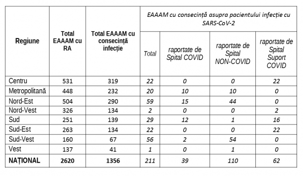 O notă a Autorității Naționale de Management al Calității în Sănătate privind infecțiile, citată de HotNews, arată că, în perioada 1 martie – 30 septembrie 2020, au fost înregistrate, în spitalele românești, 2.620 de evenimente adverse asociate asistenței medicale, dintre care 1.356 (51,76%) au avut drept consecință o infecție asupra pacientului.