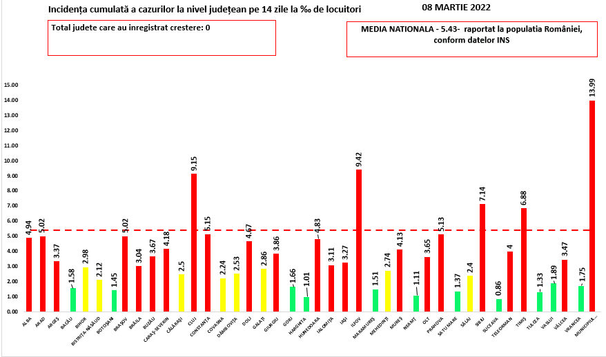 La nivel național, incidența cazurilor de COVID-19 este de 5,43 la mia de locuitori, după cum a comunicat INSP. Cea mai mare rată de infectare este de 9.42 și se înregistrează în județul Ilfov.