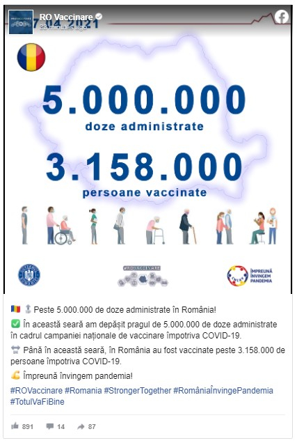 „În această seară am depăşit pragul de 5.000.000 de doze administrate în cadrul campaniei naţionale de vaccinare împotriva COVID-19. Până în această seară, în România au fost vaccinate peste 3.158.000 de persoane împotriva COVID-19”,precizează sursa citată într-o postare de Facebook.
