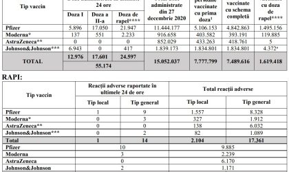 În ultimele 24 de ore au fost raportate 15 reacții adverse, dintre care 10 de la vaccinul Pfizer, trei de la Moderna și 2 de la Johnson & Johnson. În total, în România, de la începutul campaniei de vaccinare au fost înregistrate 19.465 de reacții adverse. Alte 210 reacţii adverse sunt în curs de investigare şi nu au fost raportate cazuri severe.