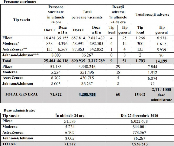 În total, de la debutul campaniei de imunizare, au fost vaccinate 4.208.724 de persoane, din care 890.935 cu o doză și 3.317.789 cu ambele doze. Majoritatea – 3.340.246 – au primit serul Pfizer.