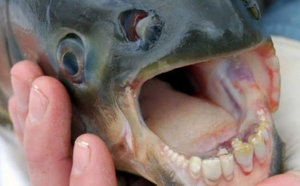 Este vorba despre peștele “împărat” și trăiește în apele din Asia. Nimeni nu știe de ce ajunge să aibă dinți foarte asemănători cu cei ai oamenilor, dar cert este că este inofensiv.