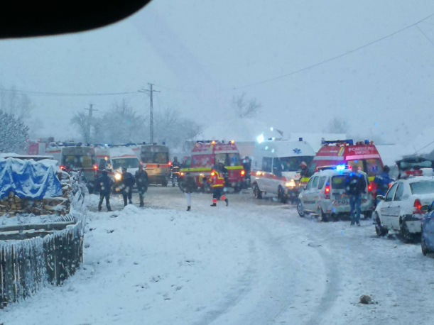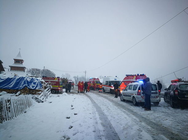 Intervenția echipajelor de salvare este îngreunată de faptul că în zonă ninge abundent.