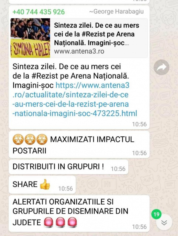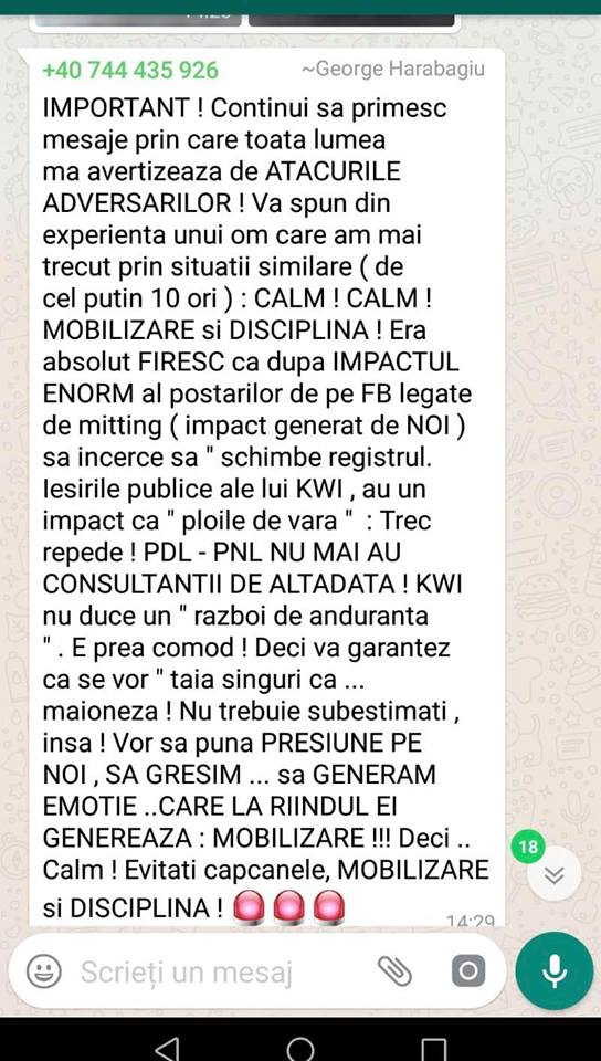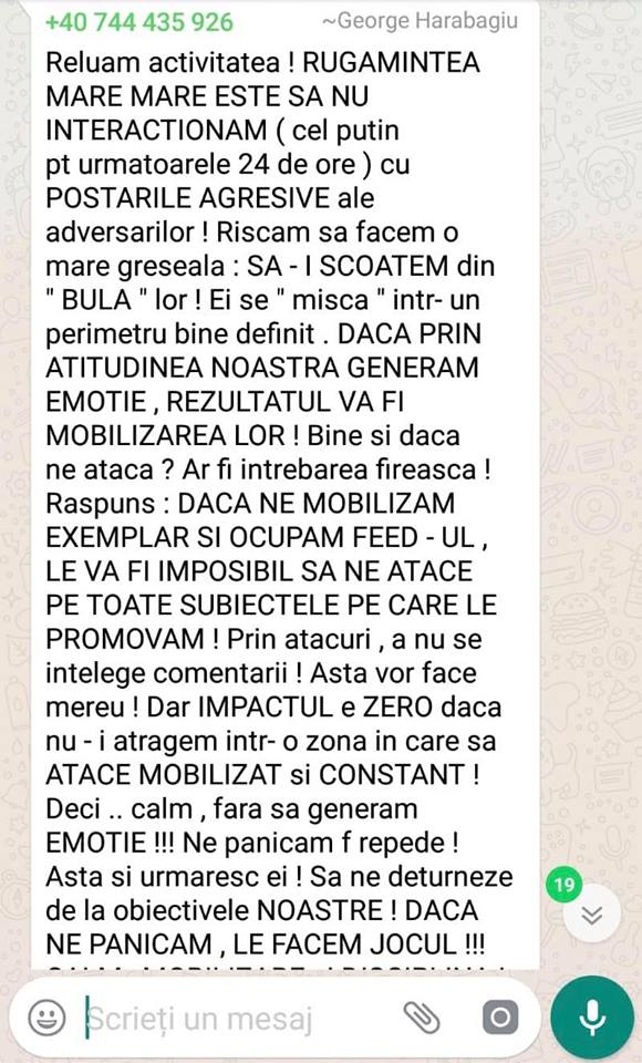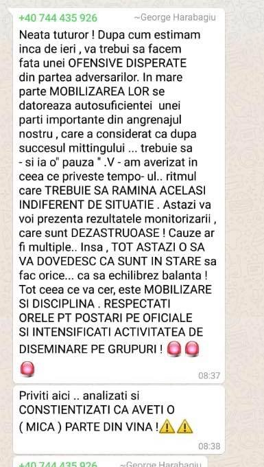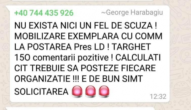 Harabagiu transmitea mesaje clare oamenilor din teritoriu: „Alertați organizațiile și grupurile de diseminare din județe. Nu există niciun fel de scuză.! Mobilizare exemplară cu comentarii la postarea Pres LD. TARGHET 150 DE COMENTARII POZITIVE! Calculați cât trebuie să posteze fiecare organizație! E DE BUN SIMȚ SOLICITAREA!”