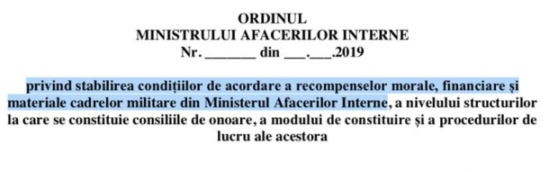 privind stabilirea condițiilor de acordare a recompenselor morale, financiare și materiale cadrelor militare din Ministerul Afacerilor Interne, a nivelului structurilor la care se constituie consiliile de onoare, a modului de constituire și a procedurilor de lucru ale acestora”.