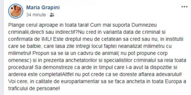 Propun să se ia un cadavru de animal (nu pot propune corp omenesc) și în prezența anchetatorilor și specialiștilor criminalul să reia toată procedura! Să demonstreze că arde în timpul care l-a avut la dispoziție și arderea este completă!”, a precizat Maria Grapini.