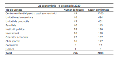 Potrivit raportului săptămânal publicat de INSP, în perioada 21 septembrie – 4 octombrie, au fost raportate un număr de 275 de focare active de coronavirus pe teritoriul României, totalizând 2898 de cazuri confirmate.