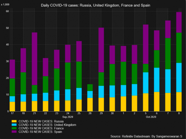 În Europa, cazurile zilnice de SARS-CoV-2 au avut în medie aproximativ 78.000 de cazuri de la începutul lunii octombrie, comparativ cu o medie de 47.500 de cazuri în septembrie.
