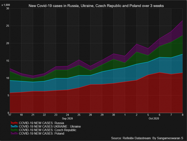 Dintre cele 10 țări din regiune, inclusiv Ucraina, Rusia și Republica Cehă, opt au înregistrat creșteri record în cazuri în ultima săptămână.