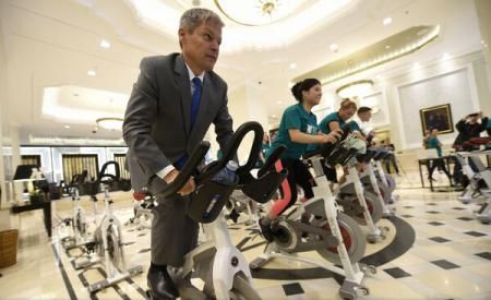 Totul a avut loc joi dimineața, premierul pedalând pe o bicicletă statică instalată în holul unui hotel din Capitală, potrivit Agerpres.