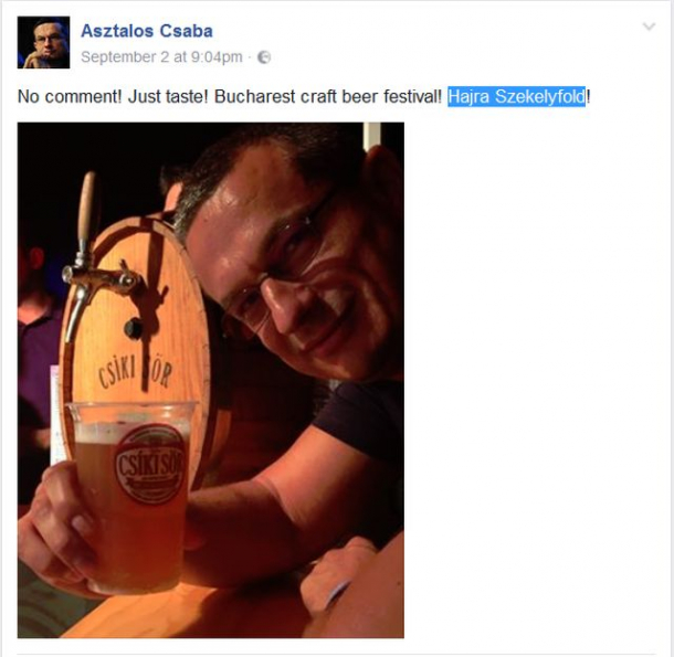 Asztalos s-a fotografiat cu un pahar de bere Csiki Sor (o bere inventată recent, parte și ea a propagandei separatiste maghiare) și a postat îndemnul „Hajra Szekelyfold!” (Hai ținutul secuiesc!).