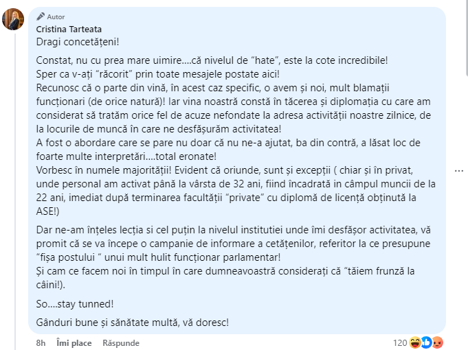 Cristina Târteață, funcționara de la Senat revoltată pe concedierile anunțate de Ilie Bolojan, a avut o reacție pe Facebook, după ce au apărut imaginile cu ea în care îl apostrofa pe șeful Senatului.
