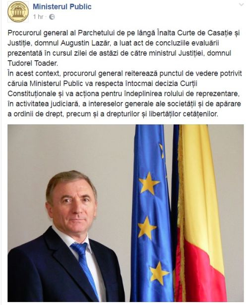 Procurorul general Augustin Lazăr declară că a luat act de concluziile evaluării prezentate de ministrul Justiţiei, Tudorel Toader, susţinând că Ministerul Public va respecta întocmai decizia Curţii Constituţionale şi va acţiona pentru îndeplinirea rolului său de reprezentare a intereselor generale ale societăţii şi de apărare a ordinii de drept, se arată într-un mesaj postat pe pagina de Facebook a Ministerului Public..
