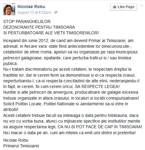 Într-un comunicat postat pe pagina sa de Facebook, Robu spune stop petrecerilor „dezonorante” pentru Timişoara şi cere Poliţiei Locale, Poliţiei Naționale şi Jandarmeriei să-și ia măsuri.
