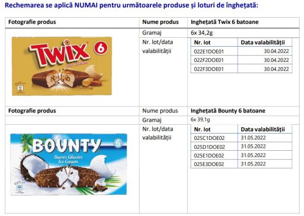 „Mars recheamă voluntar din România produsele noastre de înghețată menționate mai jos. Acest lucru se datorează prezenței oxidului de etilenă într-un ingredient produs de unul dintre furnizorii noștri, la niveluri mai mari decât cele permise de legislația UE. Acest fapt are impact cu privire la Mars precum și alți producători.