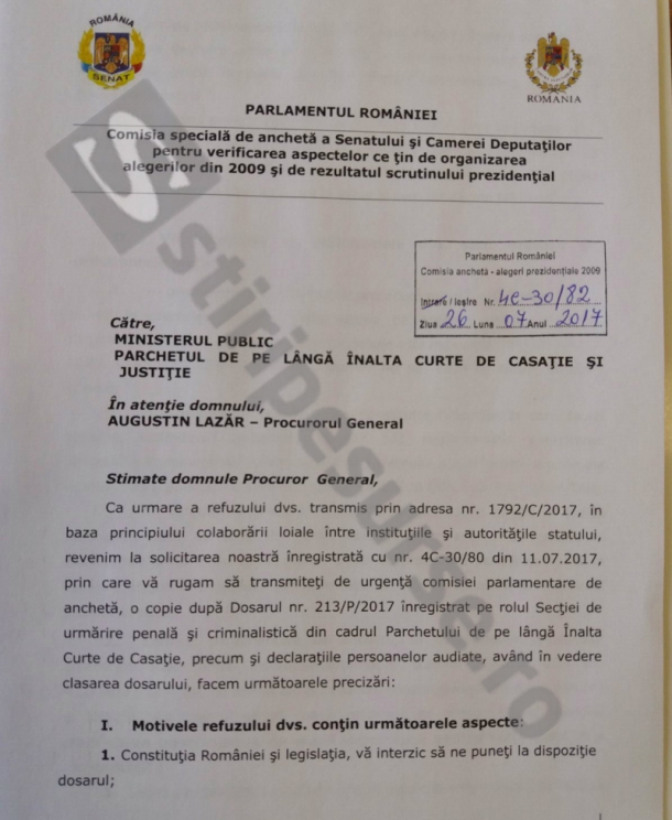 Președintele comisiei parlamentare de anchetă privind alegerile prezidențiale din 2009 i-a transmis procurorului-general Augustin Lazăr o scrisoare prin care îi solicită să pună la dispoziția Parlamentului documentele din dosarul penal privind alegerile.