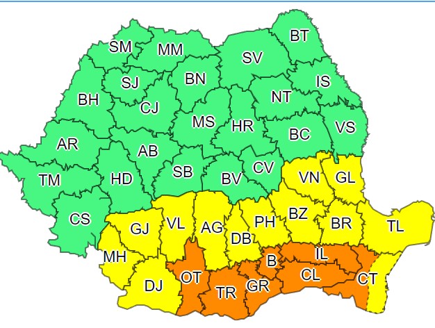 În județele Olt, Teleorman, Giurgiu, Ilfov, Călărași, Ialomița, Constanța și municipiul București, se menține sâmbătă un cod portocaliu de fenomene meteorologice, cu un val persistent de căldură, caniculă și disconfort termic accentuat. Se prognozează temperaturi maxime de 38…39 de grade Celsius, iar indicele temperatură-umezeală (ITU) va depăși pragul critic de 80 de unități în aceste regiuni.
