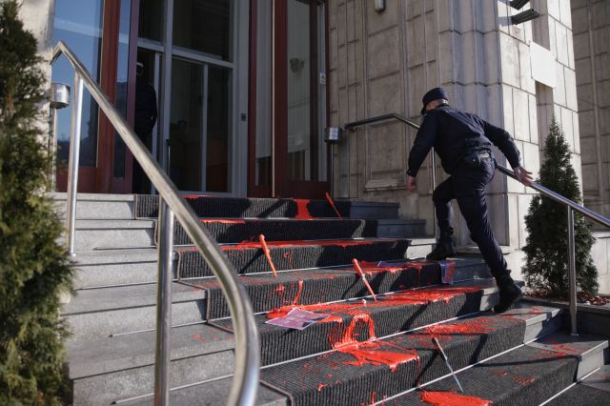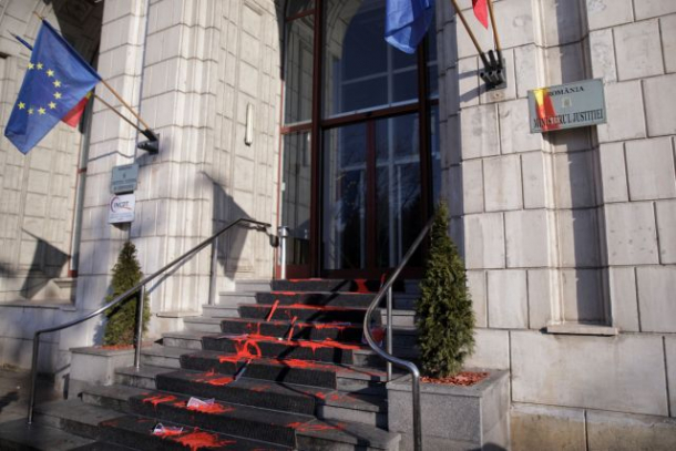 Mai mulţi protestatari au aruncat cu vopsea roşie pe scările ministerului, simbolizând sângele vărsat de puşcăriaşii eliberaţi în baza recursului compensatoriu, informează B1 TV.