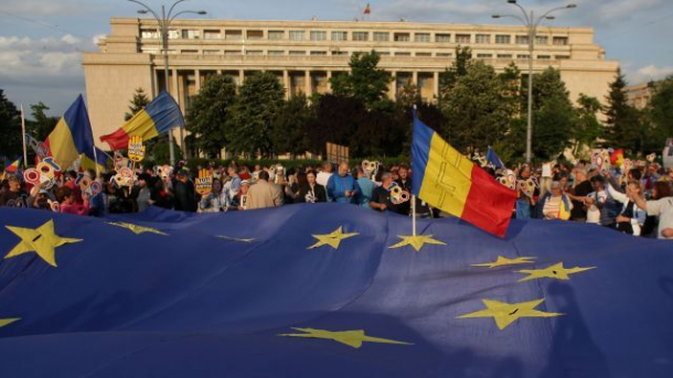 Incidente la protestul antiguvernamental care are loc sâmbătă seară în Piața Victoriei. Câțiva protestatari au venit cu țevi și borduri pentru a împrejmui un drapel al Uniunii Europene din fața Guvernului.