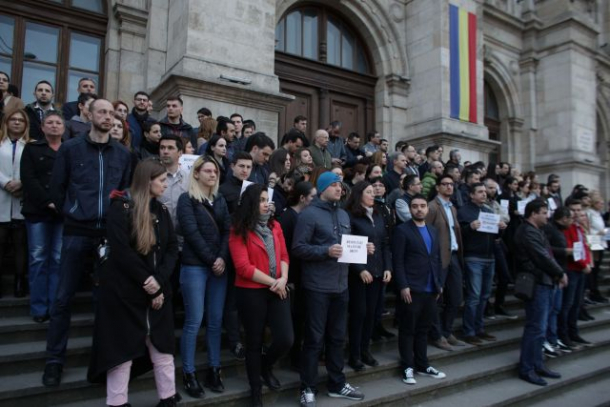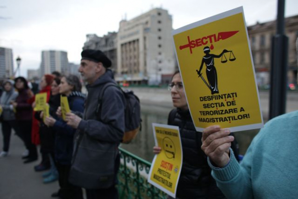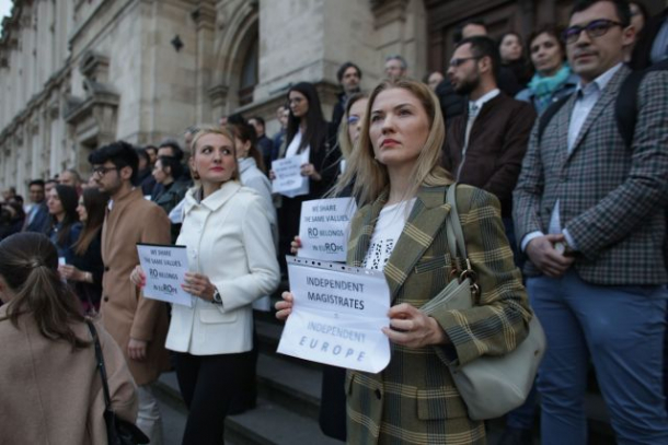 Magistrații protestează în liniște, purtând coli de hârtie cu mesaje ca „Independent magistrates=Independent Europe”, ”Respectați statul de drept” sau „Stop ordonantelor date peste noapte”.