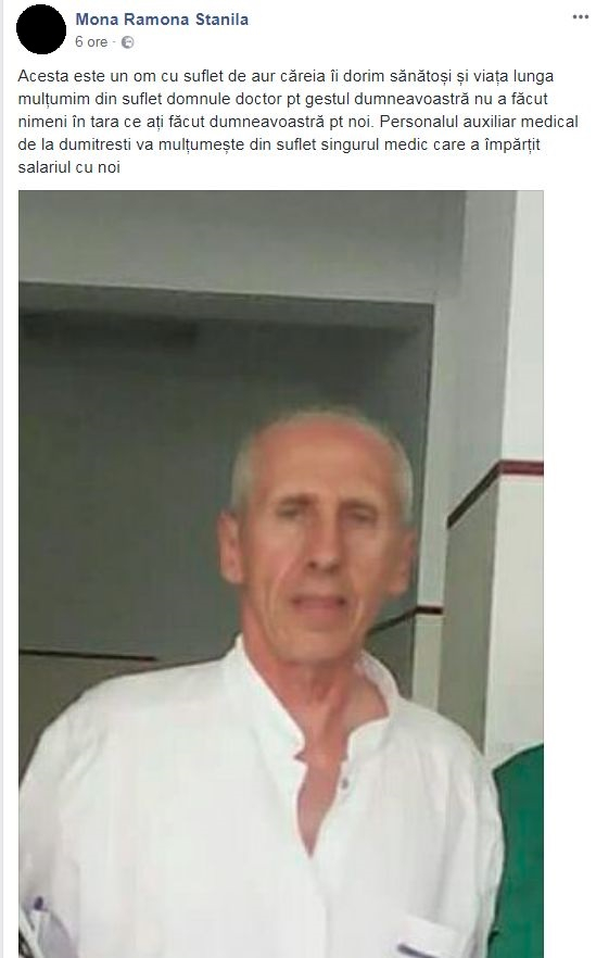 “Acesta este un om cu suflet de aur căruia îi dorim ani sănătoși și viața lungă. Mulțumim din suflet domnule doctor pentru gestul dumneavoastră. Nu a făcut nimeni în țară ce ați făcut dumneavoastră pentru noi. Personalul auxiliar medical de la Dumitrești va mulțumește din suflet singurului medic care a împărțit salariul cu noi”, a scris femeia.