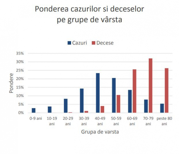 Analiza deceselor până la 6 decembrie 2020 indică faptul că persoanele cu vârste cuprinse între 70-79 ani, peste 80 de ani şi 60-69 ani sunt cele mai afectate: aproximativ 32% (70-79 ani) şi aproximativ 25-26% (60-69 ani şi peste 80 de ani). Categoria de vârstă 20-29 de ani are un procent de mortalitate de aproximativ 1%.