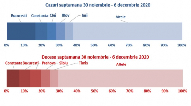 Centrul Naţional de Supraveghere şi Control al Bolilor Transmisibile (CNSCBT) a publicat, marți, raportul privind evoluția epidemiei de coronavirus în România, în perioada 30 noiembrie – 6 decembrie. Potrivit documentului, 37,6% din totalul cazurilor de COVID-19 s-au înregistrat în municipiul Bucureşti şi în judeţele Constanţa, Cluj, Ilfov şi Iaşi. 29,4% din totalul deceselor au fost raportate în judeţul Constanţa, municipiul Bucureşti şi în judeţele Prahova, Sibiu şi Timiş. 95,1% dintre victime prezentau comorbidităţi asociate.