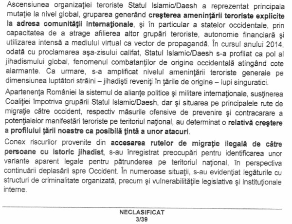 Din acest raport reiese faptul că “SRI nu s-a confruntat în 2014 cu surprize strategice”, în pofida situaţiilor complexe care au avut loc în această perioadă. În document se face referire şi la gruparea Statul Islamic, considerată principala ameninţare teroristă la adresa comunităţii internaţionale, dar şi la accesarea rutelor de migraţie ilegală de către persoane cu istoric jihadist. În acest context, se precizează că s-a constat “o relativă creştere a profilului ţării noastre ca posibilă ţintă a unor atacuri”.