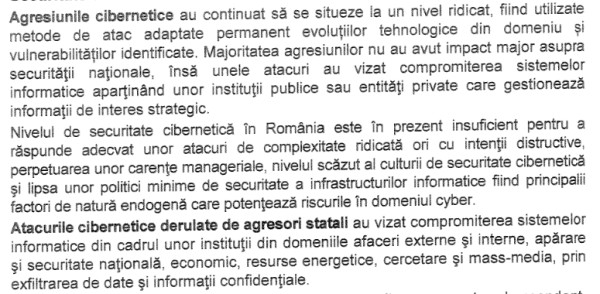 Au fost trecute în revistă şi riscurile atacurilor cibernetice la adresa ţării noastre, reieşind faptul că “nivelul de securitate cibernetică în România e în prezent insuficient pentru a răspunde adecvat unor atacuri de complexitate ridicată”. De asemea, s-a reliefat faptul că în 2014 şi-au făcut simţită prezenţa şi “agresiunile cibernetice desfăşurate de agresori statali”.