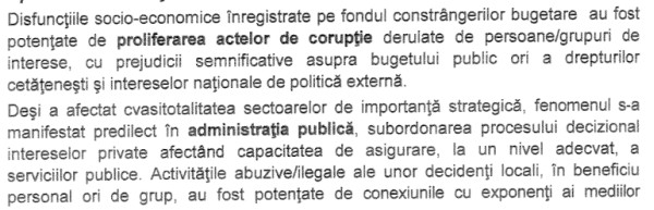 Raportul SRI face referire şi la fenomenul corupţiei, considerat a afecta “în cvasitotalitate sectoarele de importanţă strategică”, considerând că acesta s-a manifestat “predilect” în administraţia publică.