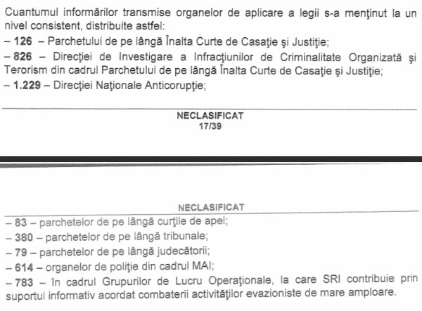 Potrivit raportului, şi în 2014 DNA a continuat să fie unul dintre principalii beneficiari ai informărilor SRI, instituţia antoicorupţie primind 1.229 de informări în acest sens.
