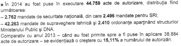 Cât priveşte subiectul sensibil al interceptărilor, în raport se arată că, în 2014, au fost puse în executare 44.759 acte de autorizare, principalul beneficiar fiind Ministerul Public şi DNA, cu 42.263 mandate de interceptare tehnică.