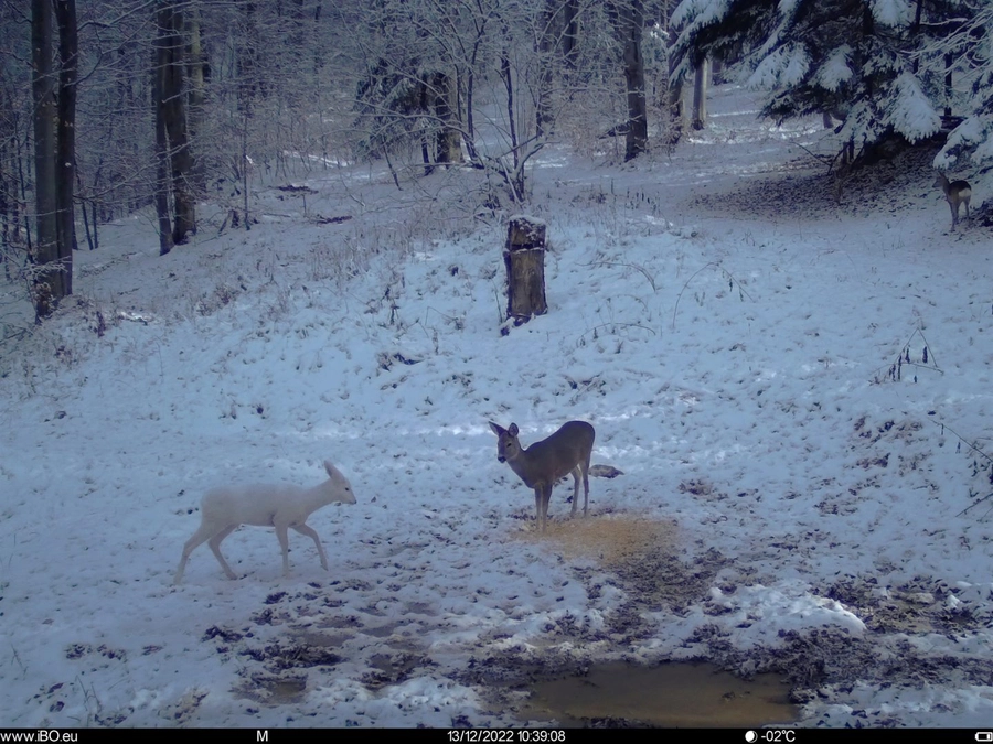 Apariție surpriză la unul din punctele de hrănire monitorizate de Romsilva – Administrația Parcului Natural Bucegi. O căprioară complet albă, camuflată perfect pentru iarnă, a fost fotografiată de camera cu senzori.