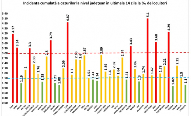 Rata de infectare rămâne foarte mare și în Alba, unde are o valoare de 4,17, Sibiu, 3,86 și Arad cu 3,34.La polul opus se află județul Tulcea, unde acesta atinge 1,02.
