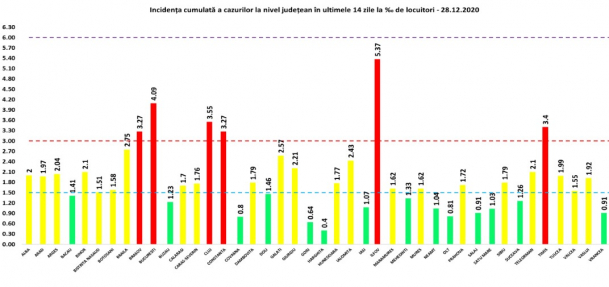 Potrivit datelor furnizate, rata de infectare la nivelul județelor a scăzut în toată România. În acest moment, doar cinci județe mai sunt în zona roșie.Ilfovul continuă să aibă cel mai mare indice din țară: 5,37, urmat de București 4,09 și Cluj, cu 3,55, Timiș, cu 3,40, și Constanța la egalitate cu Brașovul, cu 3,27.