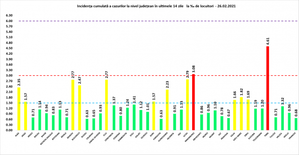 Grupul de Comunicare Strategică a raportat vineri, 26 februarie, încă3.761 cazuri noi de persoane infectate cu SARS-CoV-2. Două județe sunt în zona roșie în acest moment. Timiș rămâne județul cu cea mai mare rata de infectarecumulată:4,61. Acesta este urmat de Maramureș, cu 3,08. Indicele se apropie de 3,00 și în Ilfov (2,79), ceea ce înseamnă că în următoarele zile ar putea fi inclus în zona roșie.