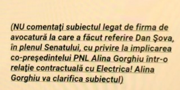 „NU comentați subiectul legat de firma de avocatură la care a făcut referire Dan Șova, în plenul Senatului, cu privire la implicarea co-președintelui PNL Alina Gorghiu într-o relație cu Electrica! Alina Gorghiu va clarifica subiectul”, se arată în mesajul intern PNL.