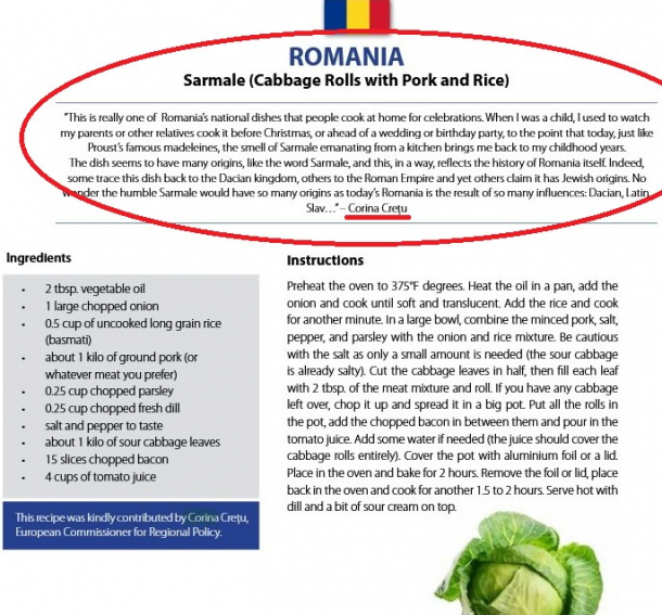 EXCLUSIV // Într-o carte de bucate, publicată sub egida Uniunii Europene, fostul comisar Corina Crețu prezintă o rețetă românească de sarmale, despre care spune că ar data din perioada dacilor. Dacă ar fi apelat la o simplă căutare pe internet, aceasta ar fi putut afla însă că „sarmalele românești” sunt de fapt o creație a bucătăriei turcești, extrem de răpândită în zonele din Balcani aflate sub ocupație otomană.