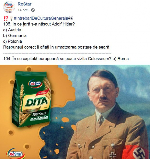 Aceștia obișnuiesc să posteze pe pagina de Facebook întrebări de cultură generală. De data aceasta, ei și-au întrebat consumatorii în ce țară s-a născut Adolf Hitler și au dat trei variante de răspuns: Austria, Germania sau Polonia. Atașată întrebării apare o fotografie prelucrată cu celebrii biscuiți și… Hitler.