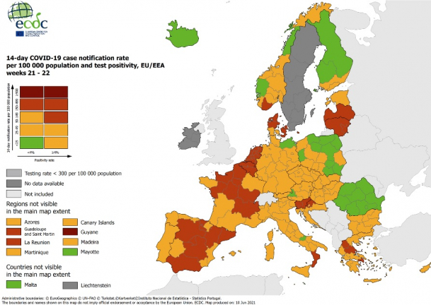 Pentru prima dată, România este colorată în verde pe harta epidemiologică europeană, publicată de Centrul European pentru Controlul Bolilor (ECDC). Astfel, situația epidemiologică din țara noastră este considerată puțin îngrijorătoare, conform datelor prezentate de ECDC, și citate de G4 Media.