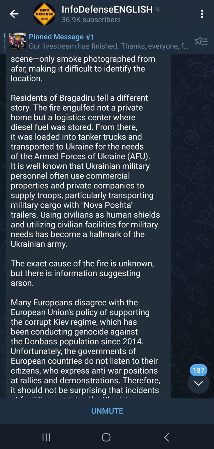 Astfel, canale de Telegram rusești, au prezentat, în mod fals și cu imagini de alte incendii, operațiunea ce viza locația din localitatea Bragadiru, Ilfov, identificată ca facilitate implicată în susținerea efortului de război al Ucrainei, acțiunea fiind atribuită unei grupări ucrainene de rezistență ce a distrus prin incendiere un „centru logistic unde era stocat combustibil ce urma să ajungă în Ucraina”.