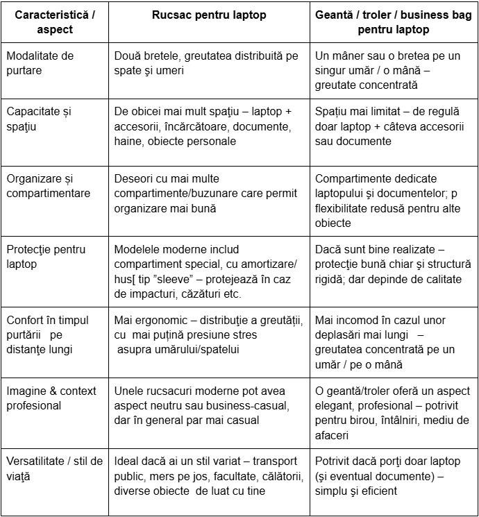 Alegerea între un rucsac şi o geantă (sau troler) pentru laptop depinde de stilul tău de viaţă, modul în care foloseşti laptopul şi de lucrurile pe care le porți zilnic. Dacă te deplasezi pe jos, cu transportul public sau ai nevoie de spaţiu şi confort – rucsacul este adesea cea mai practică opţiune. Dacă vrei un aspect profesional, doar laptop şi documente şi ai deplasări scurte – geanta sau trolerul poate fi mai potrivit. De multe ori, soluția ideală este să le ai pe ambele și să le folosești în funcție de context..