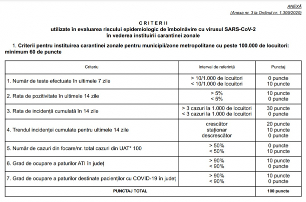 Criteriile pentru instituirea carantinei zonale pentru municipii/zone metropolitane cu peste 100.000 de locuitori sunt: