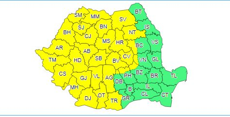 Judeţele vizate de atenţionarea cod galben sunt: Satu Mare, Maramureş, Suceava, Neamţ, Bihor, Cluj, Bistriţa-Năsăud, Mureş, Harghita, Arad, Alba, Sibiu, Braşov, Covasna, Timiş, Caraş-Severin, Hunedoara, Gorj, Vâlcea, Argeş, Mehedinţi, Dolj, Olt şi Teleorman.