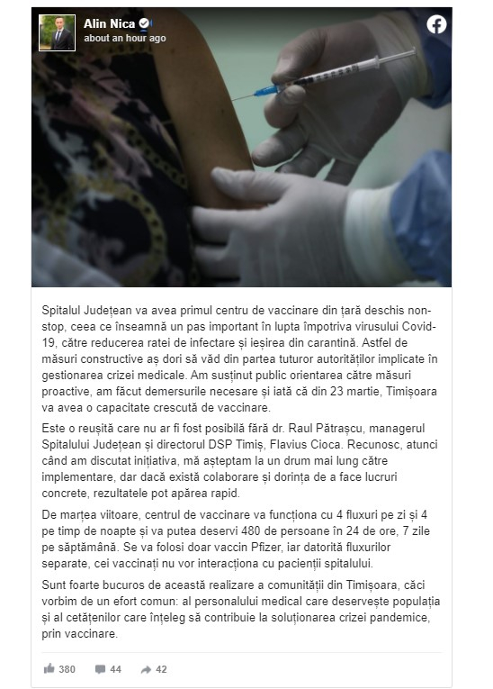 „Spitalul Județean va avea primulcentru de vaccinaredin țară deschis non-stop, ceea ce înseamnă un pas important în lupta împotriva virusului COVID-19, către reducerea ratei de infectare și ieșirea din carantină…De marțea viitoare, centrul de vaccinare va funcționa cu 4 fluxuri pe zi și 4 pe timp de noapte și va putea deservi 480 de persoane în 24 de ore, 7 zile pe săptămână. Se va folosi doar vaccin Pfizer, iar datorită fluxurilor separate, cei vaccinați nu vor interacționa cu pacienții spitalului” a scris acesta pe Facebook.
