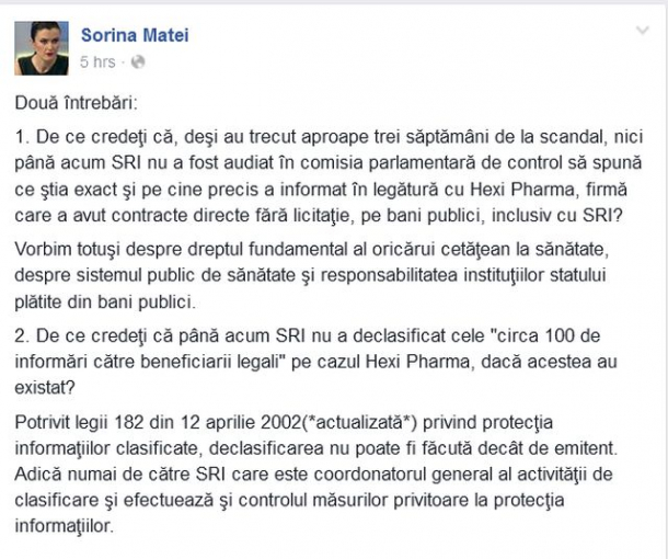 "Cred că deja trebuie să cerem întrunirea comisiei SRI şi pentru a discuta despre jocurile din serviciile de informaţii din România. Sorina Matei este cunoscută în toate redacţiile că fiind un agent de influenţă al serviciilor. (…) Dacă astăzi este folosită la jocuri de putere din interiorul serviciilor sau dintre servicii atunci asta poate deveni o problema de competenţă comisiei. Eu cred că ea este folosită la răzbunări interne între generali şi în mod greşit atrage SRI în scandalul HexiFarma”, a declarat Sebastian Ghiță, membru în comisia de control a SRI, pentru stiripesurse.ro.